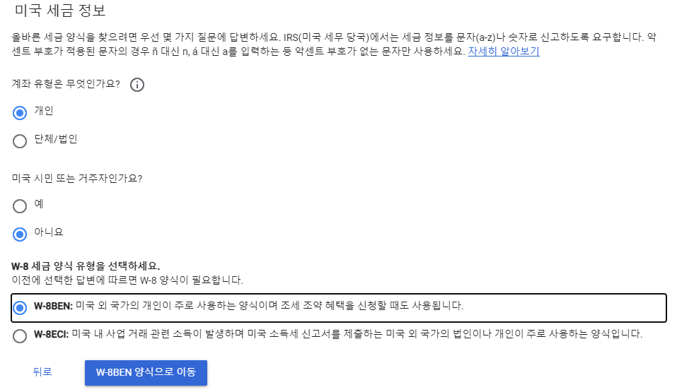 개인이며 미국에 거주하지 않는 외국인인 경우 제출하는 세금정보 양식은 W-8BEN이라고 합니다. 양식으로 이동을 눌러서 분격적으로 작성을 시작합니다.