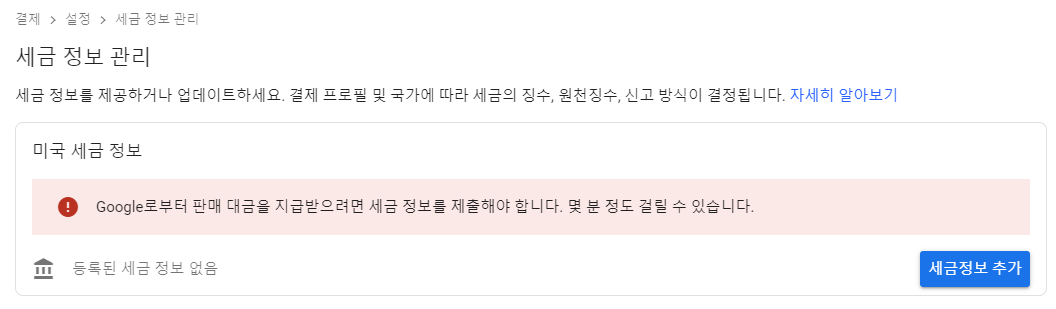 애드센스에서 경고 창의 세금 정보 관리 링크를 눌러주거나 "결제 > 설정 > 세금 정보 관리"메뉴로 이동합니다.