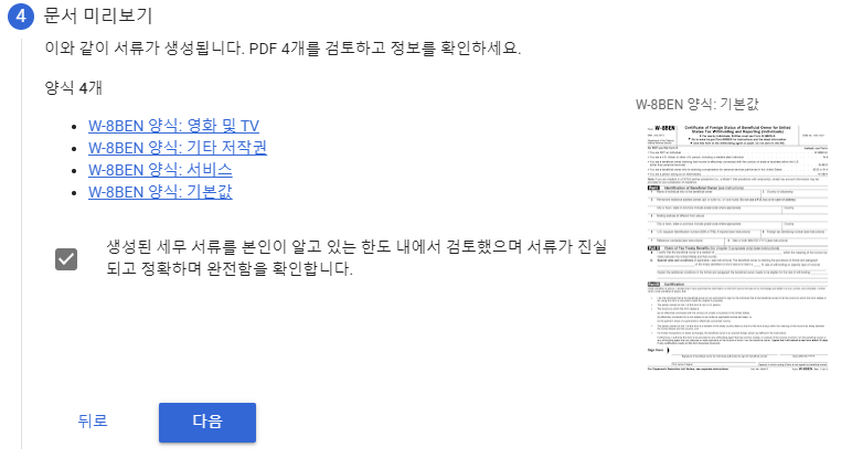입력된 정보를 바탕으로 W-8BEN양식이 만들어집니다. 링크 열어서 작성된 내용 한 번씩 검토를 하고 다음 단계로 이동합니다.