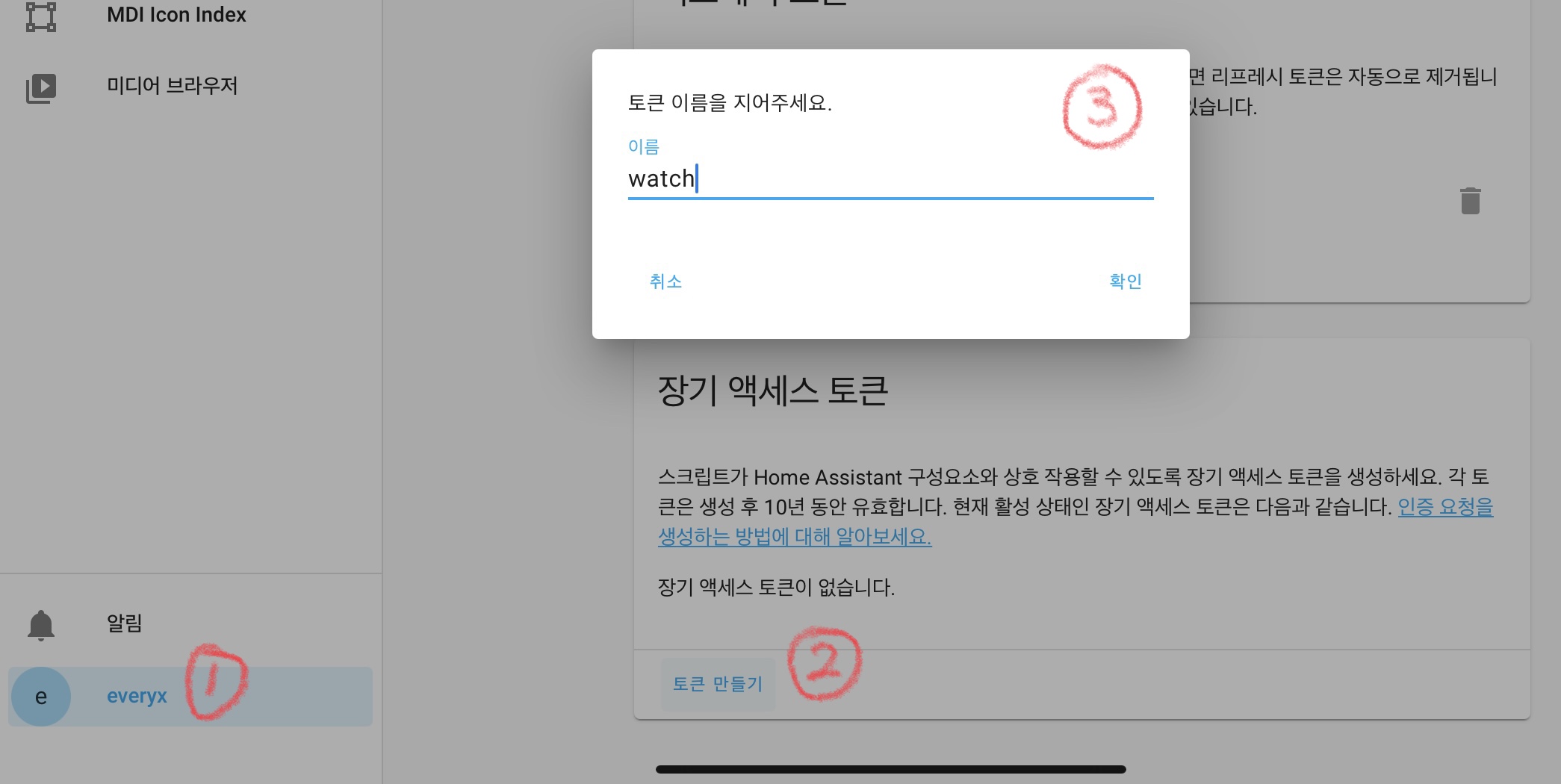 HA접속화면에서 계정관리 페이지로 이동한 다음 페이지 하단부에 "장기 액세스 토큰" 섹션에서 토큰 만들기를 눌러줍니다. 그리고 생성하고자 하는 토큰을 이름을 입력하고 확인을 클릭합니다.