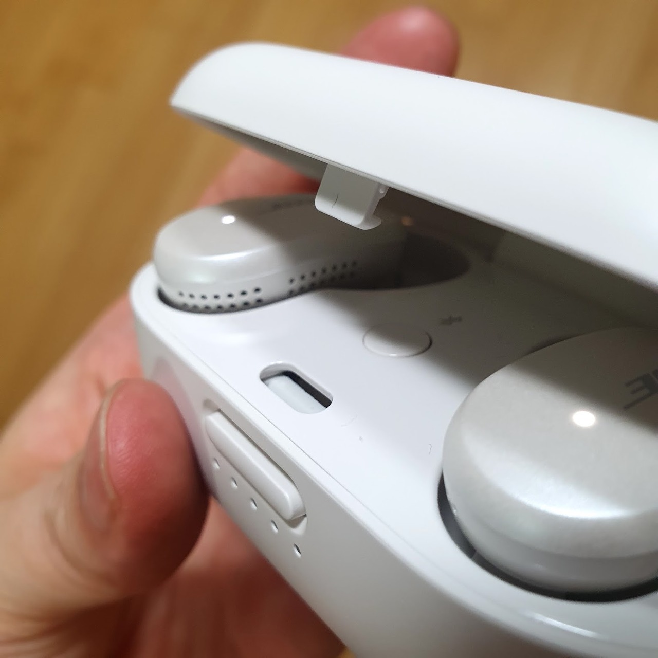 재질은 부들부들한 느낌의 무광 플라스틱입니다. 에어팟은 유광이라서 때가 묻어도 물티슈로 쉽게 제거할 수 있는 게 장점인데 QC 이어버즈는 때가 쉽게 타고 지우는 것도 쉽지 않을 것 같은 그런 재질인 것 같습니다. 사용할 때 주의가 필요하네요.
