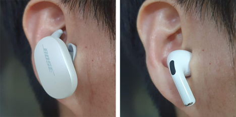 정적 환경에서 착용감은 에어팟과 QC 이어버즈를 비교하면 어느 것이 더 낫다 얘기하기 어려울 정도로 둘 다 만족스럽습니다. 하지만 QC 이어 버즈는 큰 덩치 때문에 기인하는 불가피한 약점이 있습니다. 구조상 귀 밖으로 튀어나오는 부분이 에어팟보다 많기 때문에 역동적인 활동에서는 흔들림이 생길 수밖에 없습니다. 그로 인한 진동소음도 따라오기 때문에 동적 환경에서의 착용감은 에어팟이 유리합니다.
