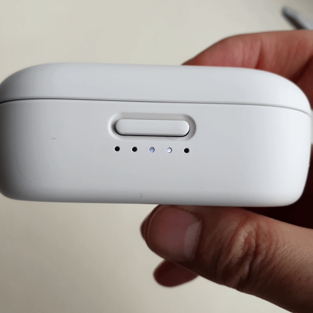케이스 전면에는 베터리 잔량을 보여주는 LED가 5개 위치하고 있어서 20% 단위로 배터리를 확인할 수 있습니다. 그리고 그 위에는 케이스를 열고 닫는 버튼이 자리하고 있는데요. 개인적으로는 아이들 장난감 같은 좀 유치한 구조를 사용하고 있습니다. 버튼을 꾹 하고 누르면 기계적으로 걸쇠가 풀리면서 스프링 힘으로 뚜껑이 열리는 구조를 택하고 있는데 버튼을 누를 때 말 그대로 꾸~욱!! 하고 눌러야 되기 때문에 한 손으로 똥폼 잡기는 아주 어렵습니다. 저는 자석으로 착착하고 열고 닫히는 에어팟이 더 고급스러운 느낌이라고 생각되네요.
