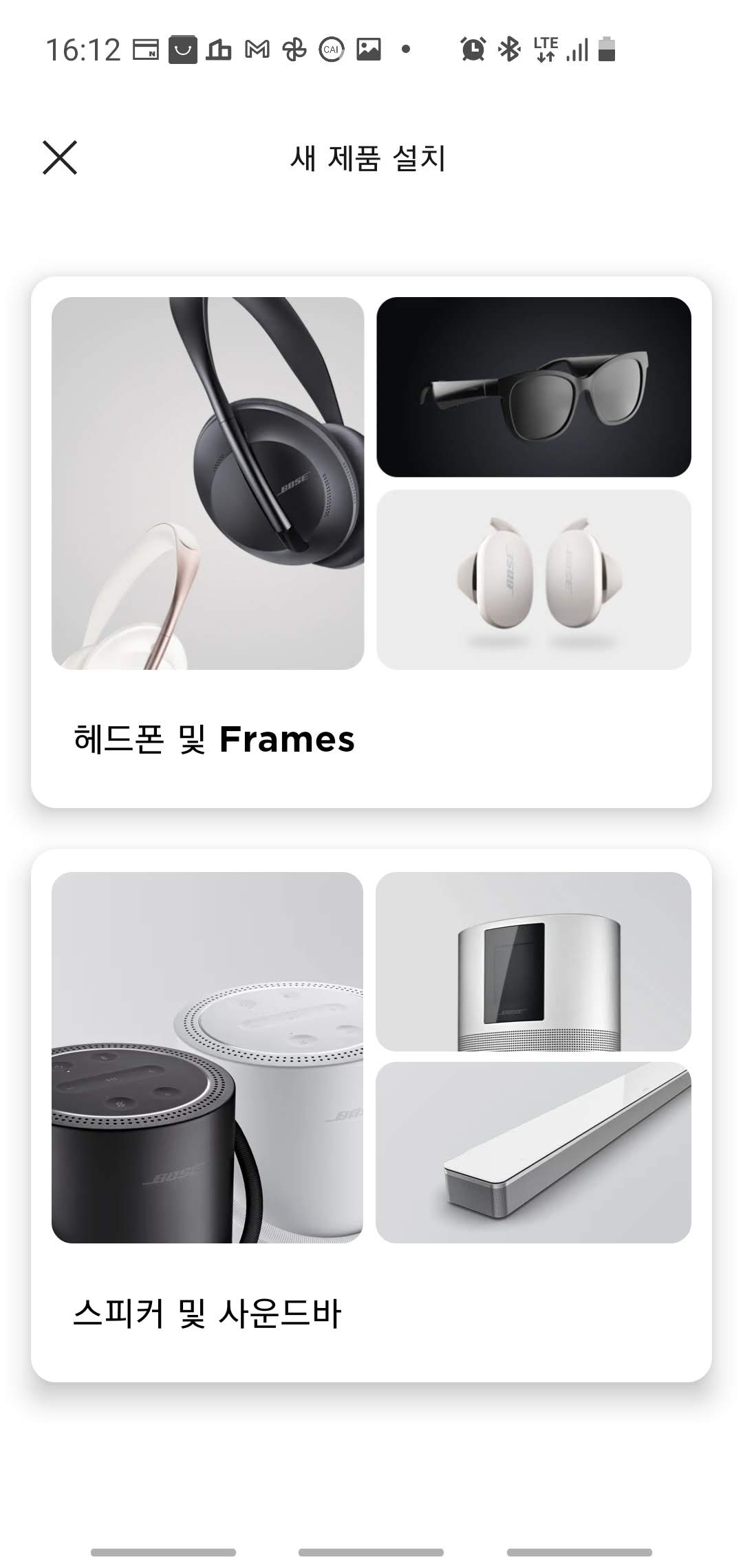앱 활성화 후 첫 화면에서 "헤드폰 및 Frames"를 선택하면 자동으로 주변의 연결 가능한 Bose기기를 검색해서 자동으로 QC 이어버즈의 연결이 시작됩니다.