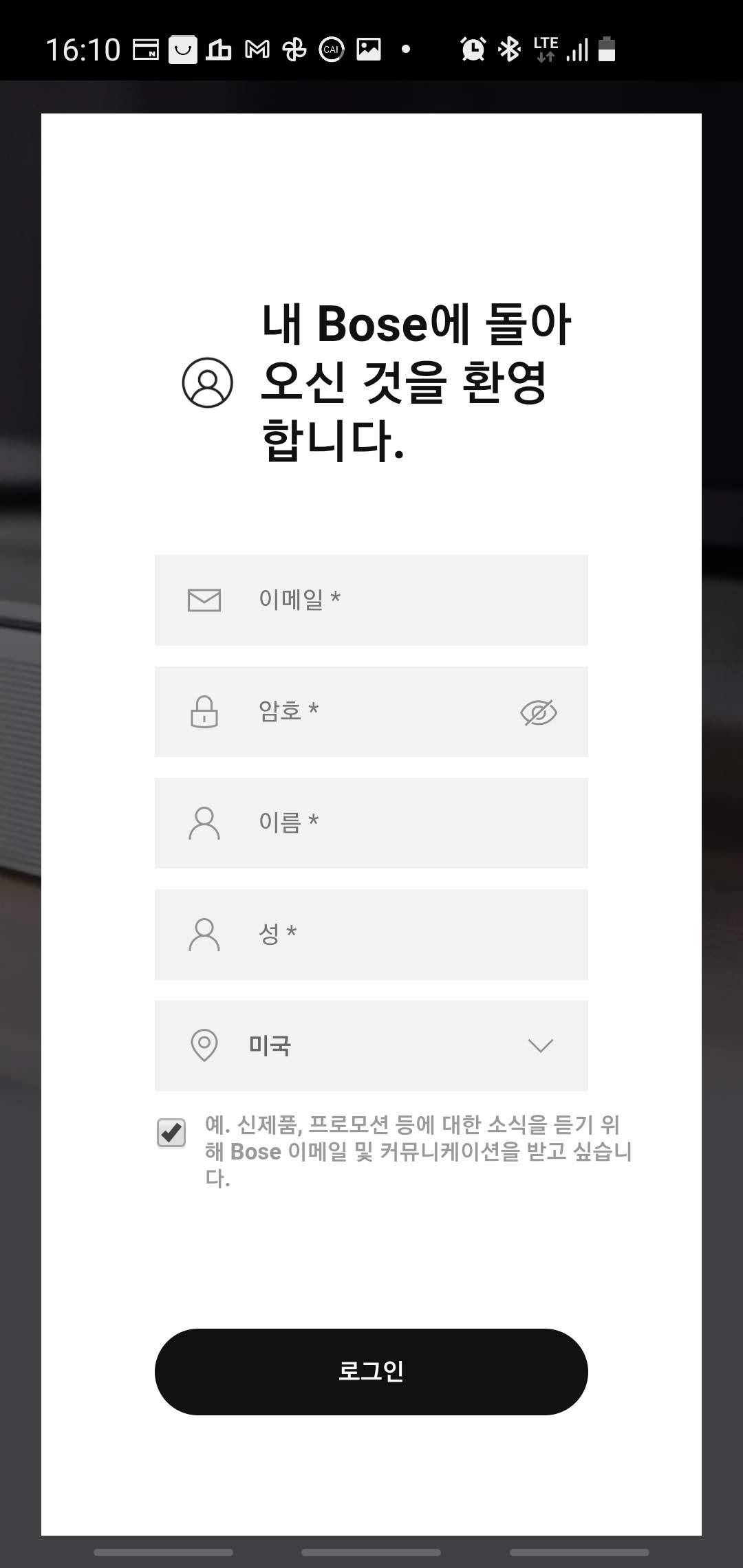 앱 활성화를 위해서 Bose 계정이 필요합니다. 회원가입을 먼저 진행합니다.