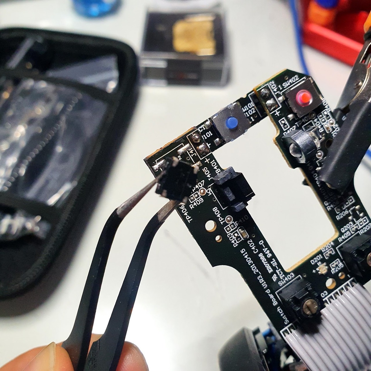 새 부품을 설치할 때는 또 녹여먹을까 봐 열풍기는 쓰지 않고 인두기로 다릿발 하나씩 땜질했습니다. 기판에 스위치 방향이 프린트되어 있으니 방향에 맞게 스위치 위치 잘 잡아주고 조심스럽게 설치 완료했습니다.