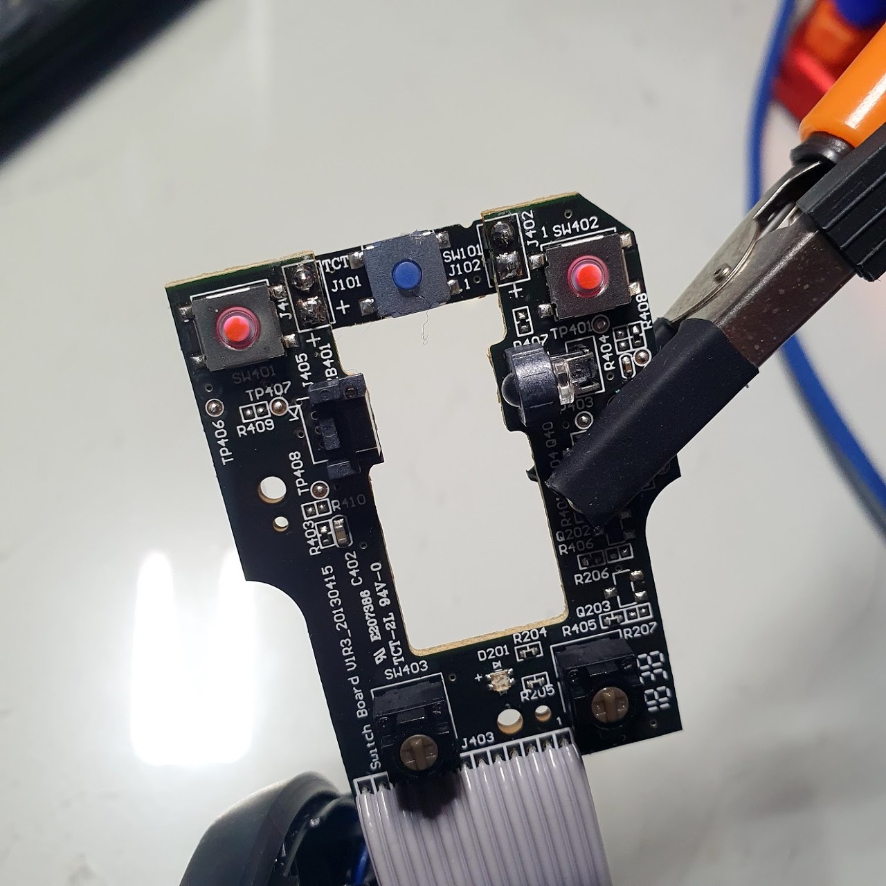 일단 기존의 고장 난 부품을 제거해야 하는데, SMD라서 인두기만 가지고는 작업이 좀 어려웠습니다. 그래서 열풍기로 천천히 가열해서 제거했는데요. 전문 지식 없이 막무가내로 하는 작업이다 보니 원래 달려있던 스위치는 아얘 녹여버렸습니다. ㅡㅡ; 지금 생각해보면 이런 건 기판 뒤쪽에서 천천히 가열했어야 하는 게 아닌가 싶네요.