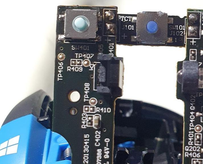 위 링크와 같은 분해기를 참고하여 어렵지 않게 분해할 수 있었습니다. 아래 사진은 클릭 버튼과 마우스 휠 등이 있는 기판입니다. 사진에서 붉은색 원이 표기된 좌우 스위치가 각각 좌, 우 클릭 버튼이며 왼쪽의 스위치가 고장 난 부품입니다.