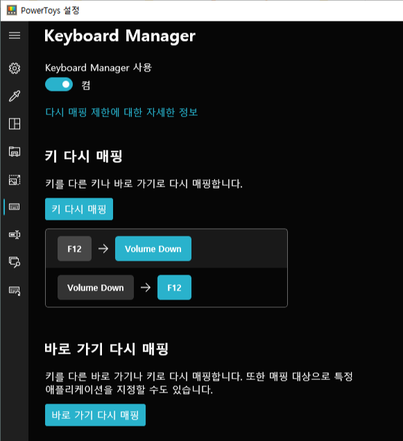 키보드의 매핑을 바꿀 수 있는 프로그램입니다. 단일 키 맵핑을 바꾸는 "키 다시 매핑"과 2개의 조합키 맵핑을 바꾸는 "바로 가기 다시 맵핑"이 있습니다. 제가 사용하는 로지텍 MX Keys 키보드가 볼륨업 키는 F12키 옆에 단독으로 할당된 키가 있는데 볼륨다운은 F12키와 "Fn"키의 조합으로 되어 있습니다. F12키는 잘 사용하지 않기 때문에 매핑을 아래 그림처럼 서로 바꾸어 봤습니다.