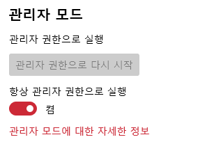 PowerToys의 모든 기능을 제한 없이 사용하기 위해서는 관리자 권한으로 실행이 필요합니다. 설정 페이지에 관리자 권한으로 사용할 것인지 선택하는 옵션이 있는데요. 관리자 모드로 재시작한 후 항상 관리자 권한으로 실행하는 옵션을 켜 두면 되겠습니다.