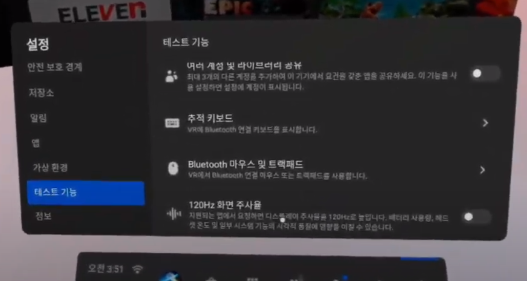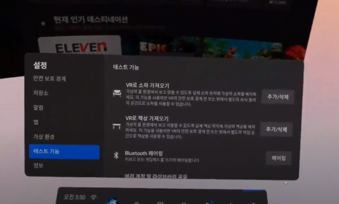 주변 사물을 가상공간으로 가져와서 나름 MR(Mixed Reality)를 경험할 수 있습니다. 소파, 책상의 위치를 가상세계에 설정하면 게임을 하다가 잠시 앉아서 쉬거나 컨트롤러를 내려놓을 때 편리하게 사용할 수 있습니다. 그리고 지원하는 무선 키보드를 사용할 경우 키보드의 렌더링 이미지가 가상 환경에 나타나서 키보드 사용을 더욱 편리하게 할 수 있습니다.