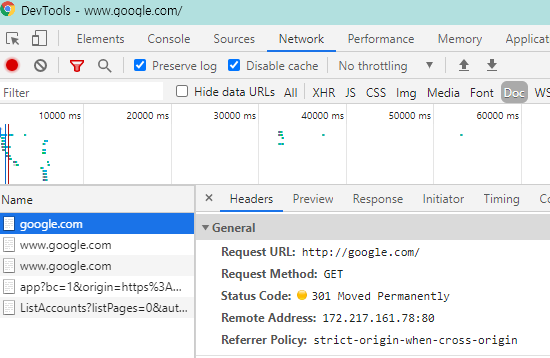 브라우저의 개발자 도구를 열어놓은 상태에서 주소창에 이동하려는 사이트의 URL을 입력하고 엔터를 누르면 브라우저는 어딘가로 메시지를 발송하는데 이 메시지의 헤더를 보면 위 사진처럼 URL을 "GET"이라는 방법으로 전송했다는 걸 알 수 있습니다. URL 문자열로만 통신을 할 수 있는 방법이라서 간단하긴 하지만 문자열이 그대로 노출되며 전송되는 데이터의 양에 제약이 있다는 단점이 있습니다.
