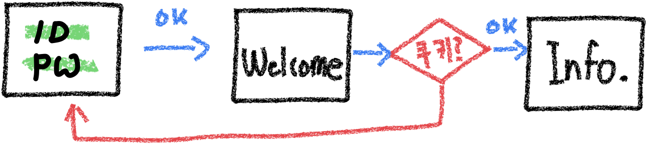 사이트의 유효한 인증을 확인하는 흐름은 위 그림과 같은 것 같습니다. 최초 로그인 시에는 아이디와 비밀번호만으로 인증을 하고 인증에 성공하면 로그인된 화면으로 이동합니다. 그런데 여기서 특정 페이지의 정보를 요청하면 아이디와 비밀번호 이외에도 추가적인 정보가 필요한 것 같았습니다.