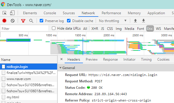 위의 코드 14행에서 분명히 status_code 200이 응답되는 걸 확인했지만 그 이후 페이지로 이동할 때마다 계속 로그인 페이지로 돌아가는 현상이 나타났습니다. 그래서 브라우저의 개발자 도구로 캡처한 로그인 과정을 다시 한번 유심히 살펴봤습니다. (제가 크롤링하고자 하는 서버에 악영향이 있을지 몰라서 해당 서버를 특정하지 않는 점 양해해 주세요.)