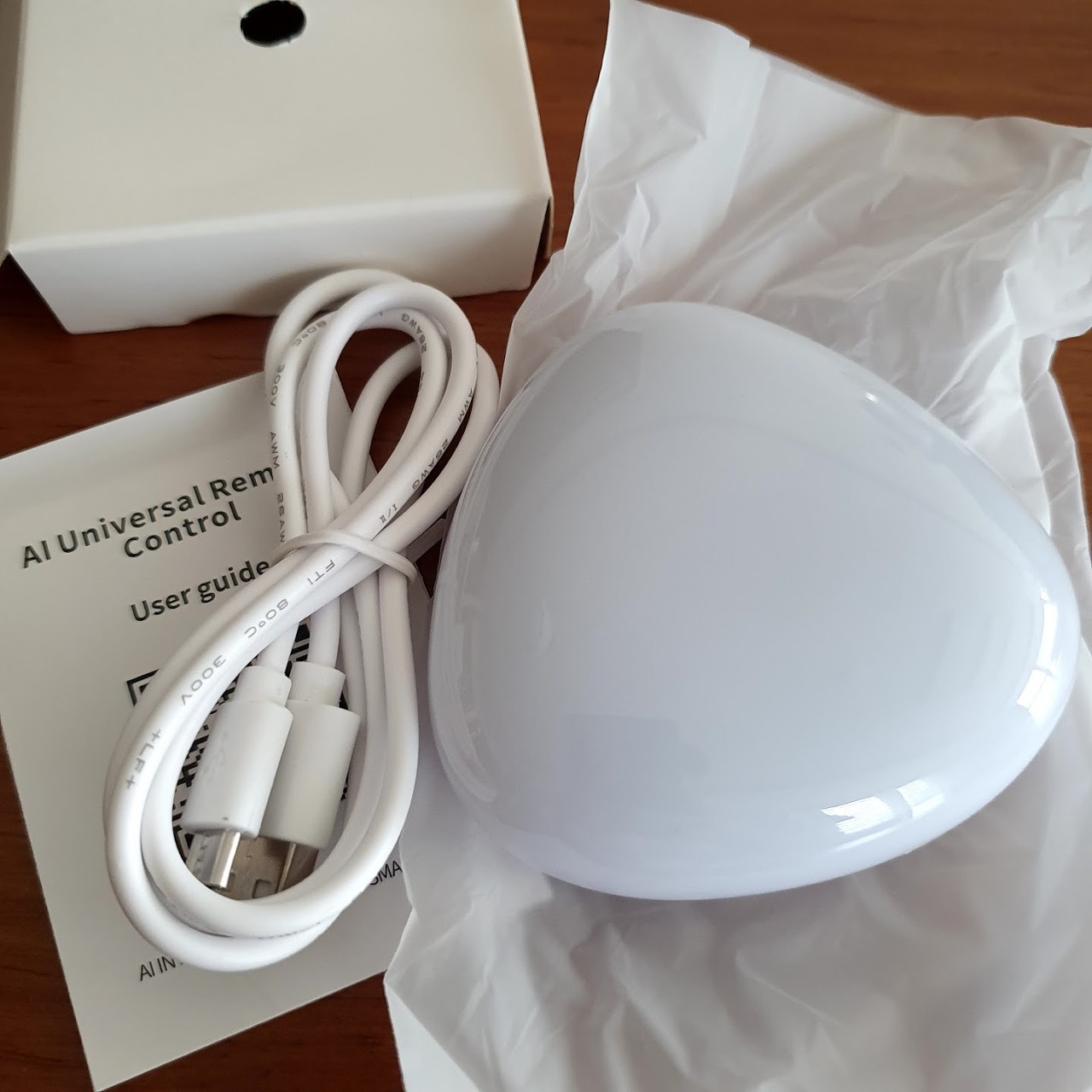 구성품은 본체와 USB 케이블 그리고 설명서입니다. 제품 본체는 윗면은 하얀색 반짝이는 플라스틱으로 되어있는데 속이 보이지는 않지만 왠지 보일 것 같은 느낌의 투명도가 약간 있는 그런 재질입니다. 아마 IR 신호가 통과를 할 수 있도록 되어 있는 것 같습니다.