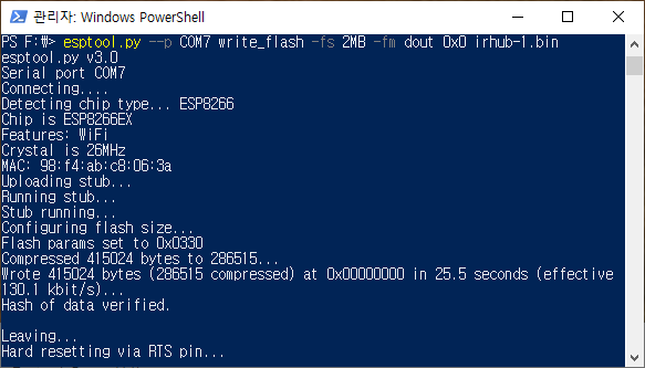 esptool.py --p COM7 write_flash -fs 2MB -fm dout 0x0 irhub01.bin