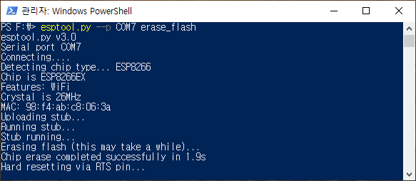 위 사진처럼 정보가 주르륵 나오면 연결이 잘 되었다는 겁니다. 여기서 제가 필요한 정보는 밑에서 2번째 줄에 있는 flash size입니다. 2MB네요.