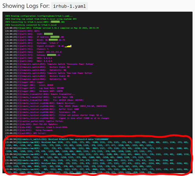 이제 등록하고 싶은 리모컨 신호들을 로그로 읽어서 ESPHome 펌웨어에 스위치로 하나하나 추가만 해주면 되겠습니다.