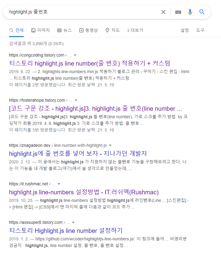 그래서 "highlight.js 줄번호"라고 검색해보면 커스텀 라이브러리를 이용해서 highlight.js에서 줄 번호를 보이게 하는 방법을 설명한 블로그들이 엄청나게 나옵니다.