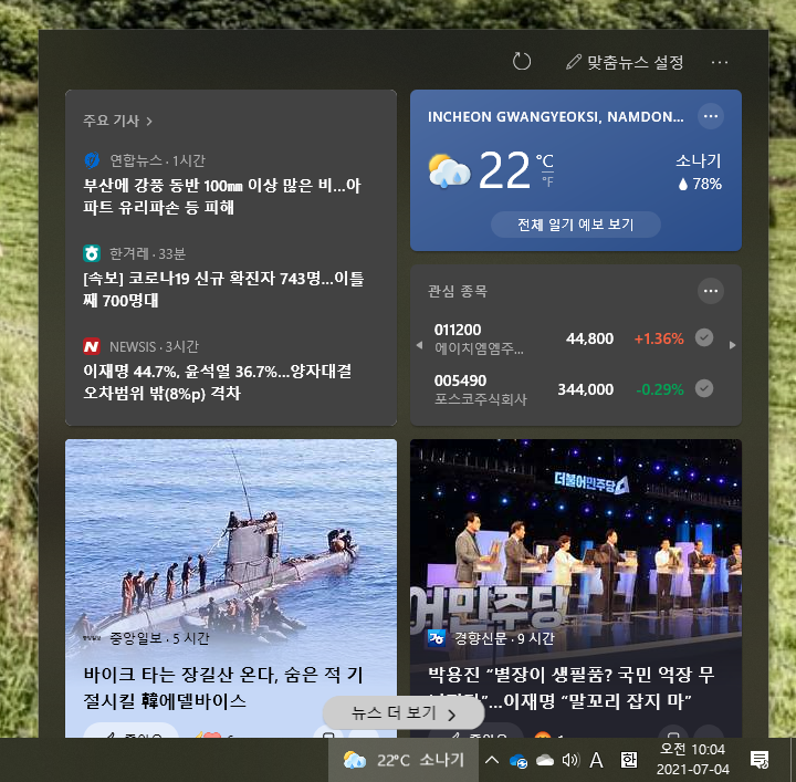 위젯이 별도 창으로 분리되었습니다. 윈도 10에서도 어느 순간 작업표시줄 우측에 뉴스 위젯이 추가되었는데 거의 유사한 느낌으로 추가되었습니다. 윈도+W 단축키 혹은 작업표시줄의 단축 아이콘으로 실행할 수 있습니다. 아래 화면 좌측이 윈도 11이고 우측이 윈도 10입니다.