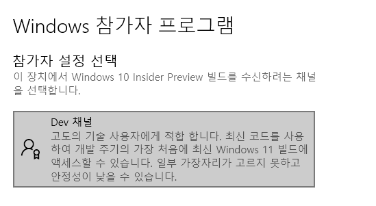 여기서 참가자 설정 선택을 눌러보시면 3가지 옵션이 있는데요. 이 중에서 "Dev 채널"을 선택하면 윈도 11을 빨리 접하실 수 있습니다.