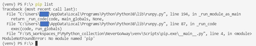 pip 모듈을 실행해 보려면 이제는 pip가 없다고 나옵니다. 이럴 때는 pip를 다시 받아서 설치해주면 됩니다.