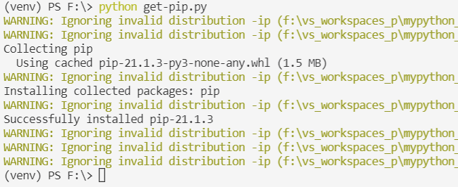 중간중간에 경고가 있긴 하지만 결론적으로는 새로운 pip가 성공적으로 설치되었습니다.
