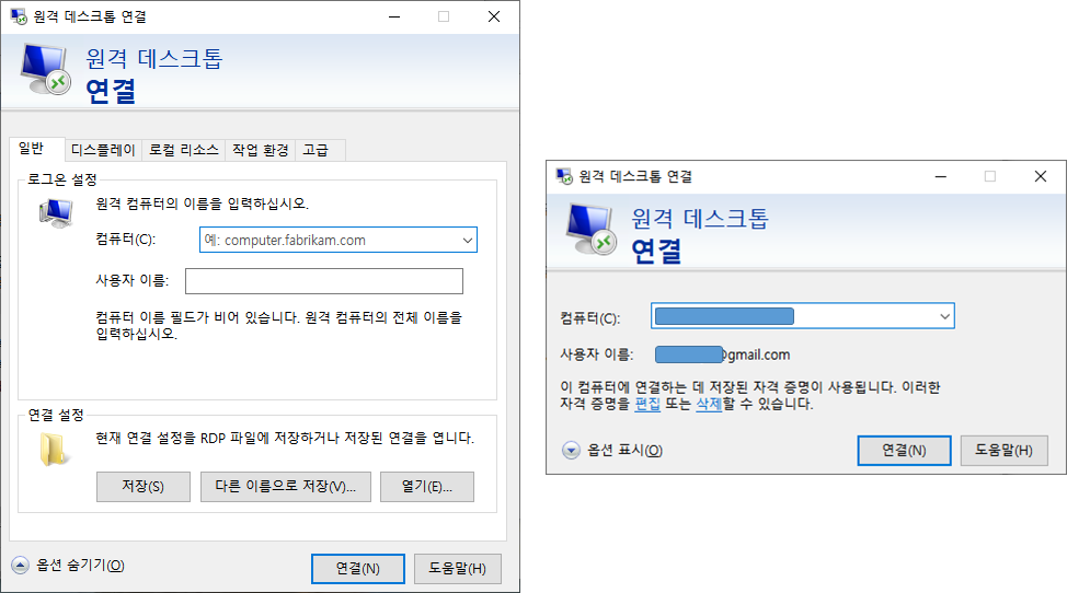 원격 데스크톱(RDP)을 사용할 때 접속하고자 하는 PC, 허용된 계정의 ID와 비번을 통해서 인증하고 접속할 수 있습니다. 그리고 이 자격 증명은 매번 입력할 필요 없이 한번 저장해 두면 따로 입력할 필요 없이 바로 접속이 가능합니다.