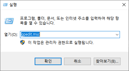 먼저 실행창을 열고 "gpedit.msc"를 입력해서 로컬 정책 편집기를 실행합니다.