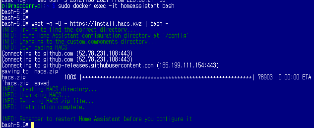 설치는 스크립트로 진행할 수 있습니다. 터미널을 열어서 HA 컨테이너 안으로 들어가서 다음 명령어를 입력합니다.