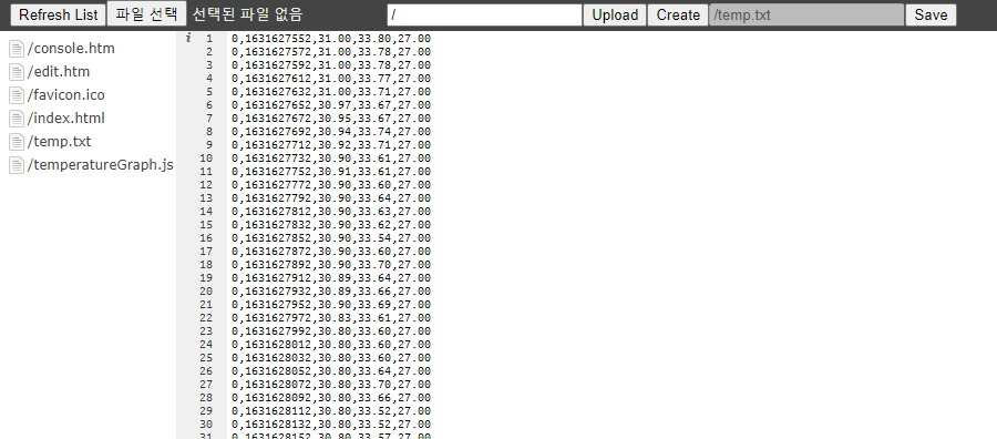 다음으로 "/edit.htm"파일을 열어보면 파일 시스템에 저장된 파일들을 확인할 수도 있고, 여기서 바로 편집도 가능합니다. 목록 중 "/temp.txt"파일을 열어보면 기록된 결과를 텍스트로 확인할 수도 있습니다.