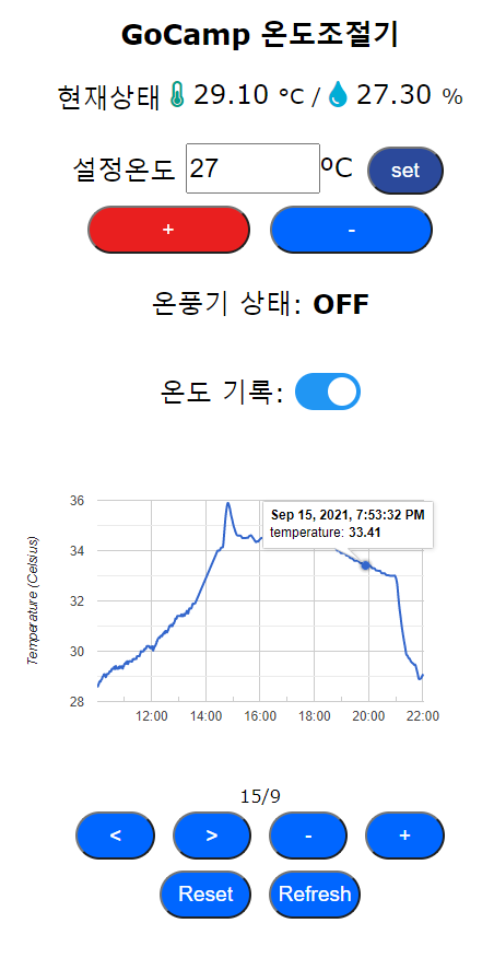 인터페이스는 기존 스마트 플러그와 거의 동일합니다. 대신 현재 온도와 습도 값이 웹소켓으로 전달되고 Java Script로 웹소켓 메시지를 파싱 해서 화면에 뿌려주는 방식으로 동작하도록 하였습니다. 그래서 웹페이지에서 별도의 온도 값 갱신 요청이 없더라도 변화되는 온도를 즉시 확인할 수 있습니다. 그리고 각 버튼들도 눌려질 때마다 별도로 지정된 메시지가 웹소켓으로 송신될 수 있도록해서 스마트 플러그와 핸드폰의 연결이 좀 더 다이내믹하게 되었습니다.