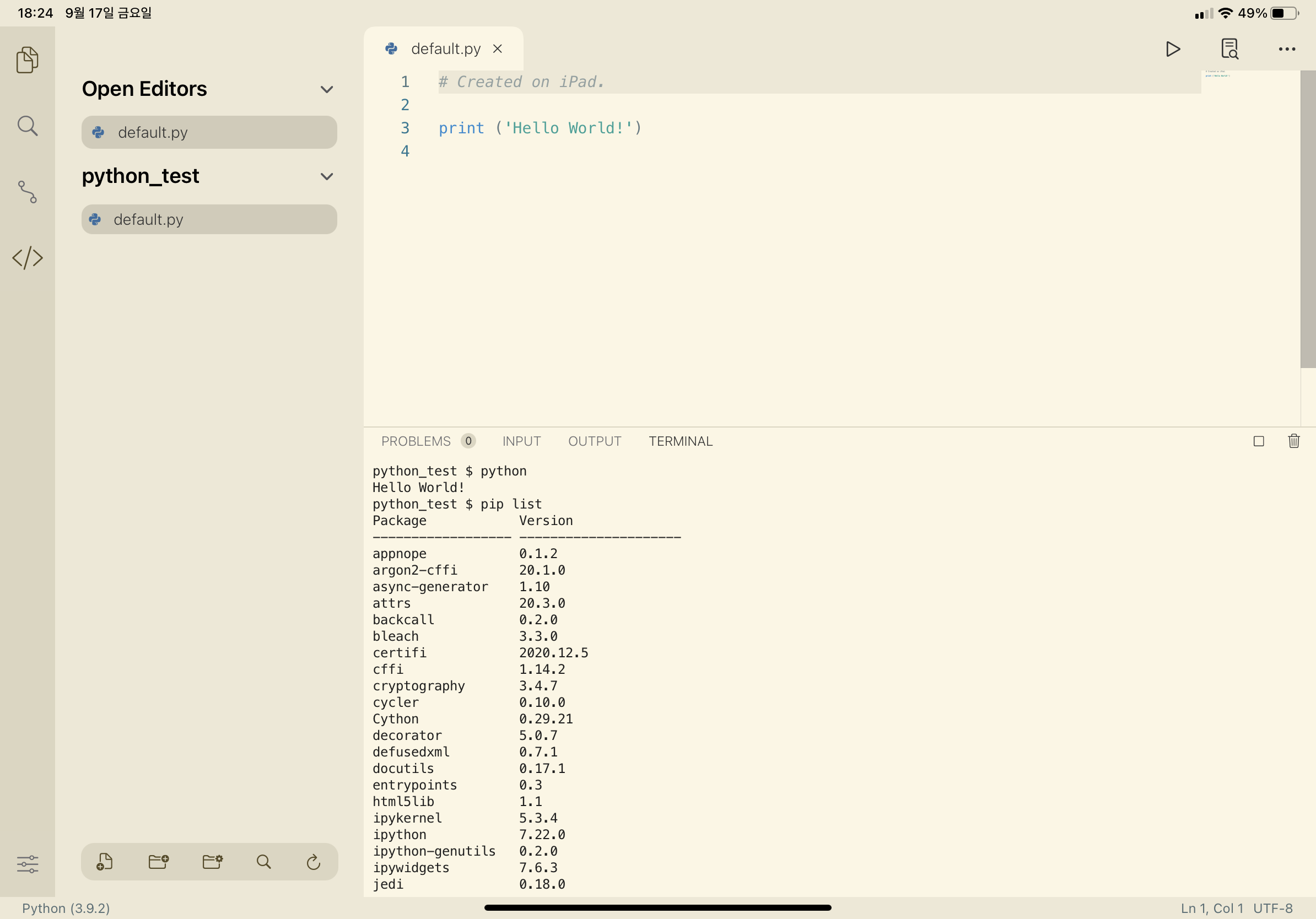 그리고 또 하나 Code App만의 강점은 바로 로컬에서 직접 코드 실행이 가능하다는 점입니다. 첨에 Code App은 IDE라고 스스로를 구분 짓고 있다고 말씀드렸는데 IDE라면 당연히 코드를 쓰고 컴파일해서 결과물을 만들 수 있어야겠죠. Code App은 정말 코드를 실행해 볼 수 있습니다.