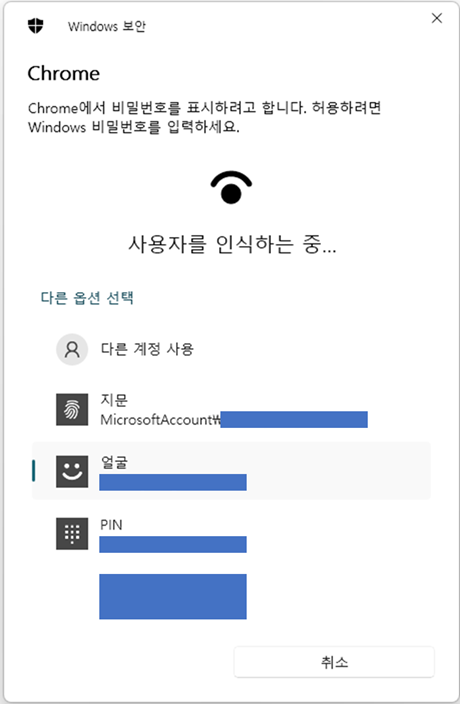 Windows Hello가 되면 윈도 로그인할 때뿐만 아니라 가끔씩 사용자 인증이 필요해서 로그인 비밀번호를 넣어라고 할 때도 유용하게 사용할 수 있습니다.
