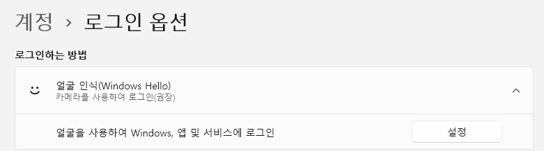 이제 윈도 헬로 활성화해 보겠습니다. 윈도 설정을 열고 "계정 > 로그인 옵션"으로 이동합니다. 로그인하는 방법 중 얼굴 인식이 활성화되는데요. 얼굴을 사용하여... 로그인이라고 된 부분의 설정 버튼을 눌러서 Windows Hello 설정해 줍니다. 카메라를 쳐다보고 있으면 오래 걸리지 않아서 설정이 완료됩니다.