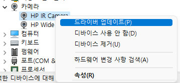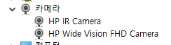 장치 관리자를 열어보면 HP Camera라고 드라이버는 설치가 되고 카메라를 인식을 한 것을 확인할 수 있습니다만 정상 동작을 하지는 않습니다.
