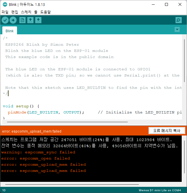 wemosd d1 mini 모듈이 벽돌이 되었을 때 해결하는 방법입니다.