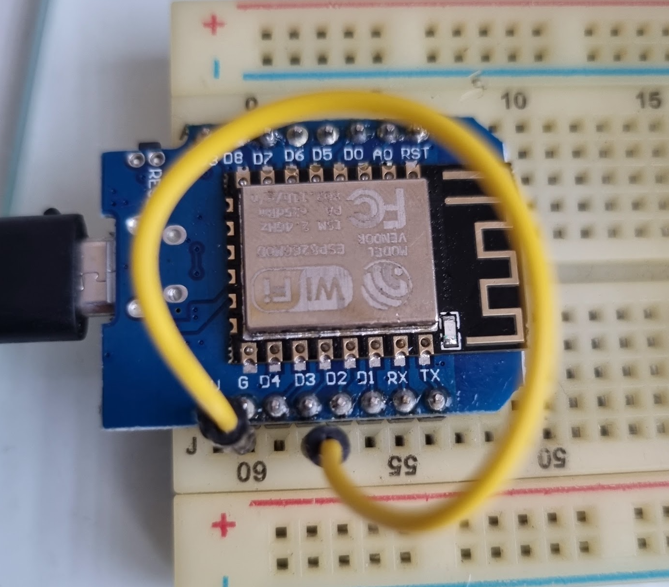 GND-D1포트를 연결한 상태에서 USB에 연결해줍니다. ESP8266을 다운로드 모드로 부팅시키기 위해서 GPIO0번 포트를 LOW 상태로 부팅을 시키는 방법입니다. 그런데 전 이 방법이 통하지 않았습니다. 만약 모듈의 내장된 파란색 LED가 완전히 꺼지거나 켜지는 상태가 아닌 희미~하게 켜진 상태가 된다면 조짐이 좋지 않다는 뜻입니다.