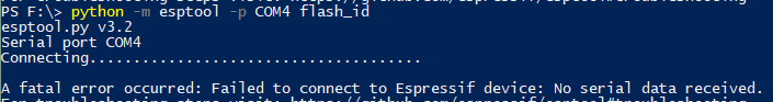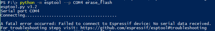 컴퓨터에서는 모듈의 USB 인식에 아무런 문제가 없지만 esptool에서 모듈 정보를 전혀 읽어오지 못하고 펌웨어를 리셋하려고 해도 계속 에러만 발생합니다.