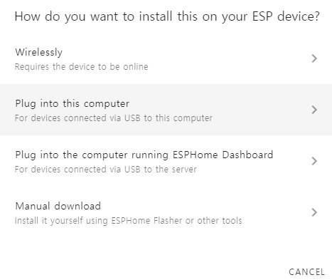 이런 귀찮은 상황에서 한 가지 반가운 것은 ESPHome dashboard가 최근에 업그레이드되면서 컴파일한 파일을 디바이스로 올릴 수 있는 옵션 하나가 추가가 되었습니다. 코드 편집 화면에서 "Install"버튼을 눌러보면 팝업창이 뜨면서 어떤 방법으로 설치를 할지 확인하는 절차가 생겼는데요. 그중에서 2번째 "Plug into this computer"라는 옵션이 있습니다.
