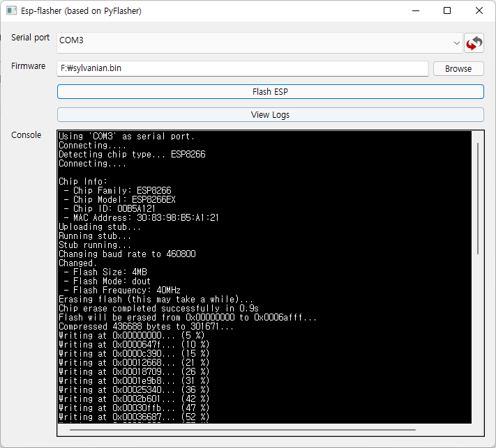 이번에는 ESPHome 사용에 특화된 ESPHome-flasher입니다. 앞에서 본 Nodemcu pyflahser와 거의 유사한데 바이너리 파일에서 펌웨어 업로드 시 필요한 값을 읽어와서 자동으로 설정을 잡아주는 기능이 있어서 사용자가 간섭할 부분을 더 줄인 심플함이 특징입니다.