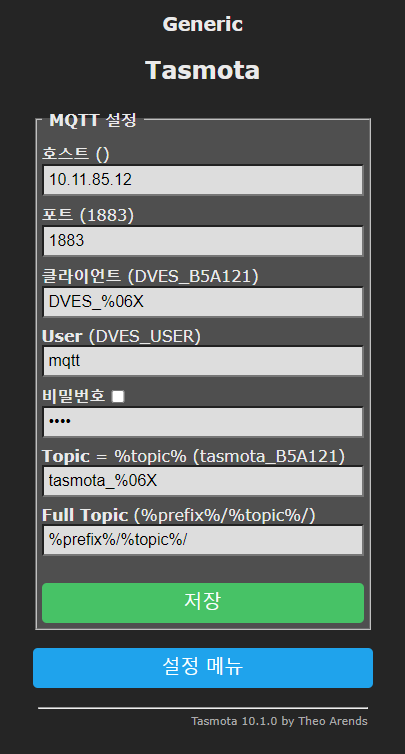 설정 메뉴 > MQTT설정 메뉴로 이동을 해서 HA 서버에서 동작하고 있는 MQTT broker 설정을 입력해 줍니다. "호스트, User, 비밀번호"란만 입력하면 되네요.