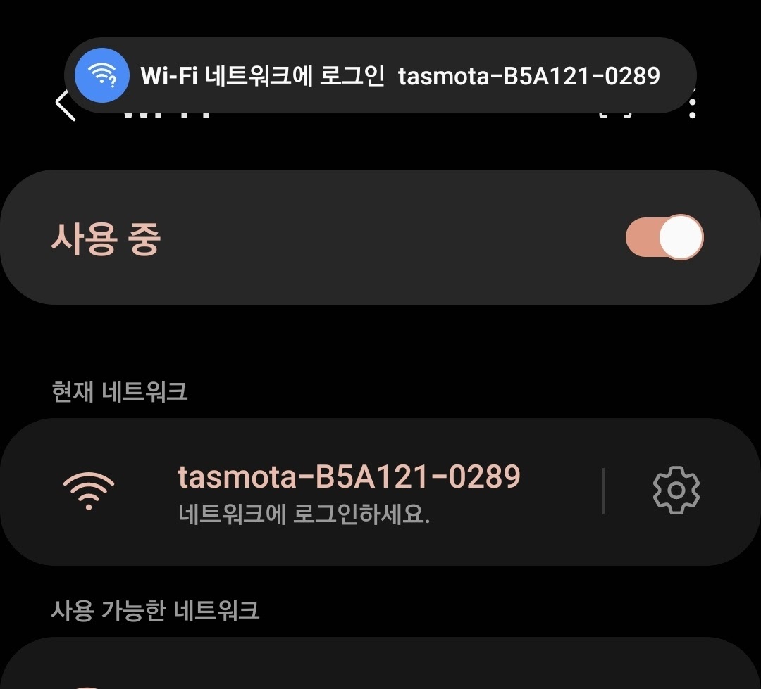 Tasmota가 설치 완료된 ESP모듈을 리부팅하면 최초에는 Hotspot 모드로 시작을 하게 되는데요. 스마트폰이나 노트북 등으로 와이파이 신호를 검색해 보면 "tasmot-"로 시작하는 SSID를 확인할 수 있습니다.