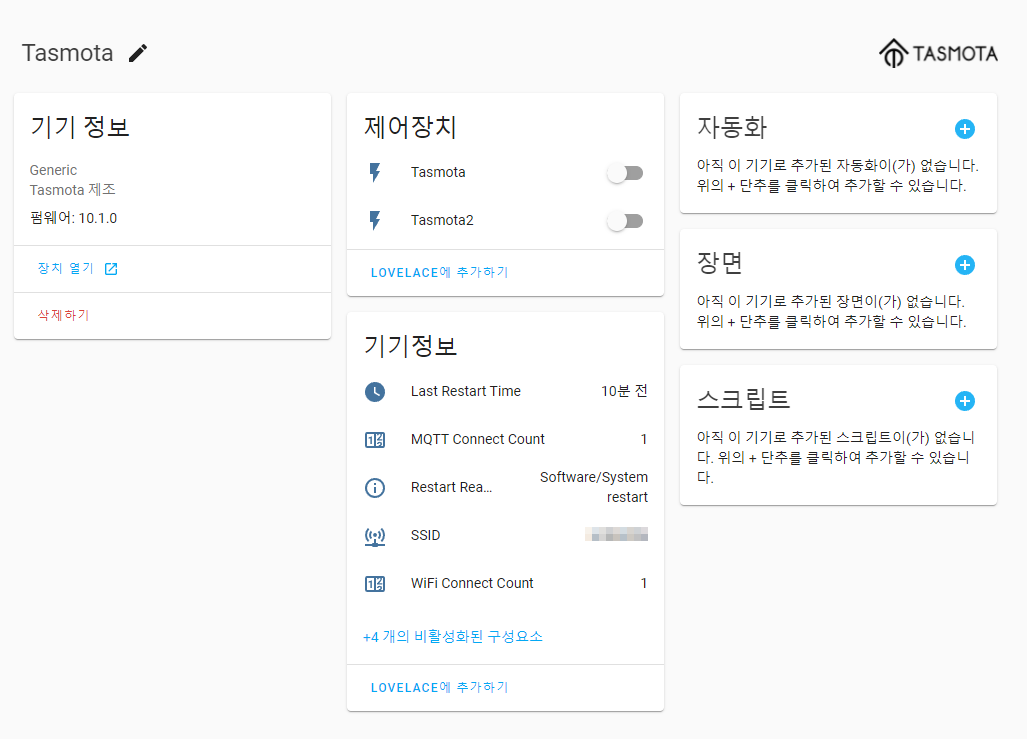 여기까지 설정을 하고 나서 HA에서 Tasmota 통합 구성요소를 추가해주면 자동으로 새로운 장치가 인식되네요. 아래는 HA 화면입니다.