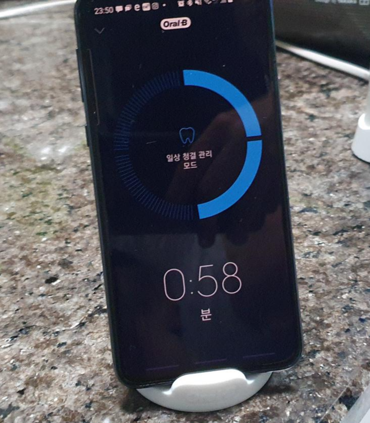 어플의 대표적인 기능은 치아를 크게 4구역을 나누어서 각 구역별로 30초씩 나누어서 칫솔질을 할 수 있도록 소요시간을 시각적으로 보여주는 기능이 있습니다. 그래서 핸드폰 거치대도 들어있는데 처음 몇 번은 신기해서 사용을 했는데 한 1주일 정도 쓰고 나니 더 이상 핸드폰 연동 기능은 사용하기 않게 되네요.