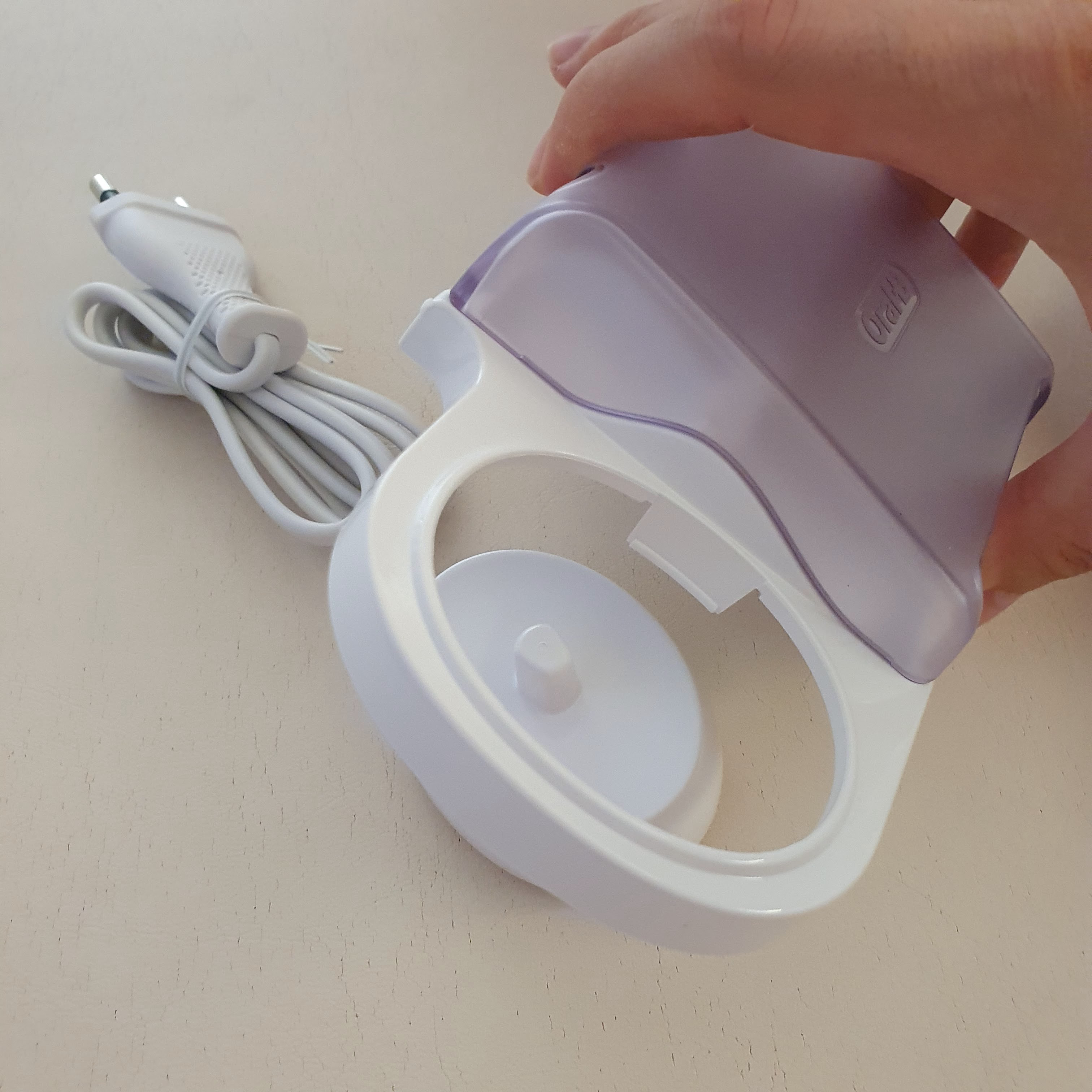 그리고 칫솔 보관케이스는 충전기와 결합이 되는 구조인데요. 구멍에 쑥 집어넣으면 충전 패드와 칫솔 보관함이 합체되어서 깔끔한 정리가 가능합니다.