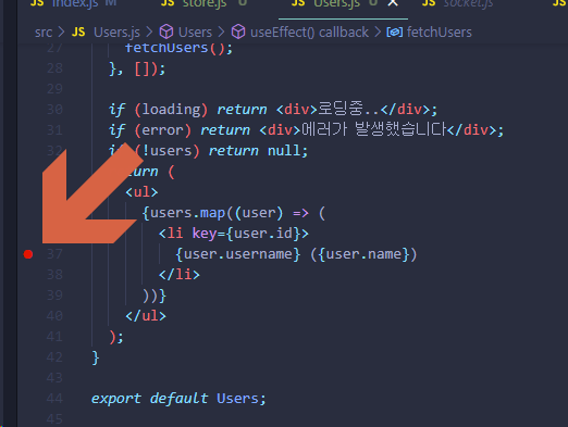 소스코드로 가셔서 브레이크 포인트를 걸고 싶은 부분의 줄번호 옆을 클릭해서 BP를 생성합니다. 빨간 점 보이시죠?
