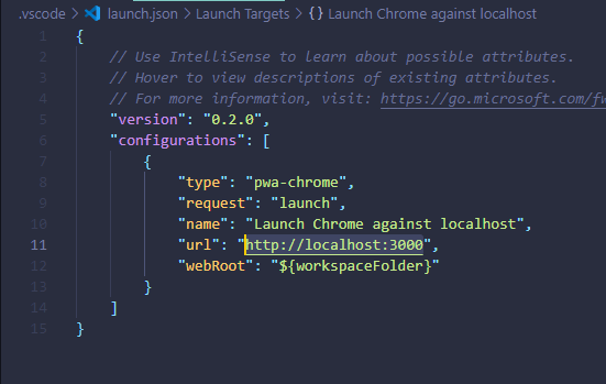 그러면 'launch.json'이름의 파일이 생성되고 오른쪽 편집창에 내용이 보이는데요. 여기서 "url"이라고 된 항목을 좀 전에 복사했던 주소로 바꿔줍니다. 저는 포트번호가 8080이었는데 3000으로 변경했습니다. 그리고 "name" 항목에 지정된 이름 한번 기억해주고 넘어가겠습니다. 이 이름은 원하는 이름으로 변경해도 됩니다.