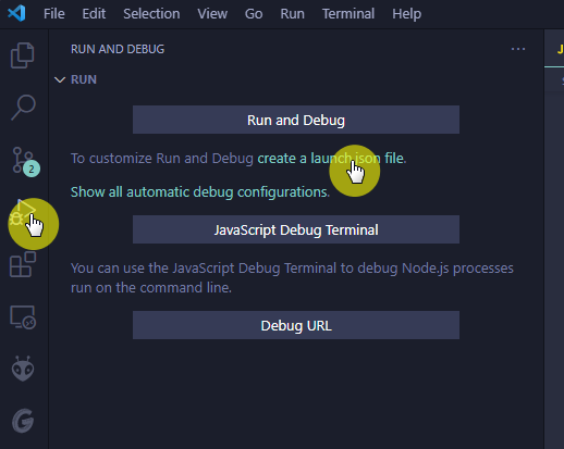그런 다음 VSCode 좌측의 디버깅 메뉴로 이동해서 "create a launch.json file"이라고 된 링크를 누릅니다.