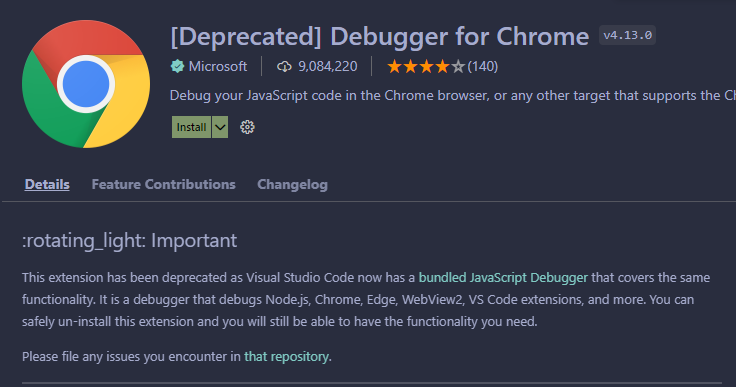 이렇게 간단한데 전 왜 그렇게 헤맸던 걸까요? 인터넷 찾아보면 "Debugger for Chrome"이라는 익스텐션을 사용하는 방법을 많이 볼 수 있는데요. VSCode에 자바스크립트 디버거가 내장되면서 이 익스텐션은 이제 더 이상 필요 없게(Deprecated) 되었습니다.